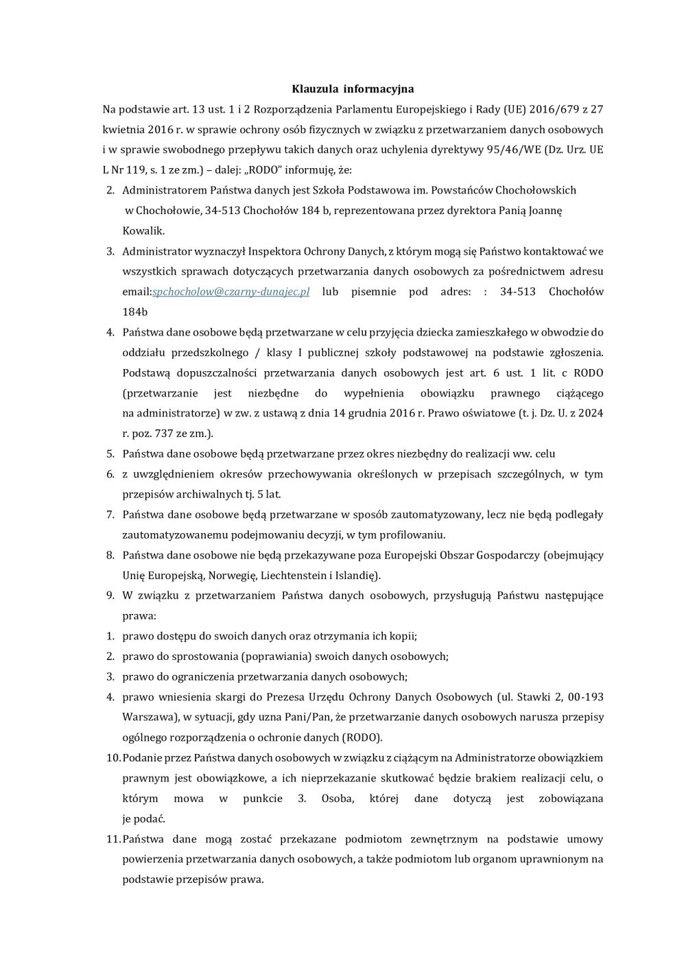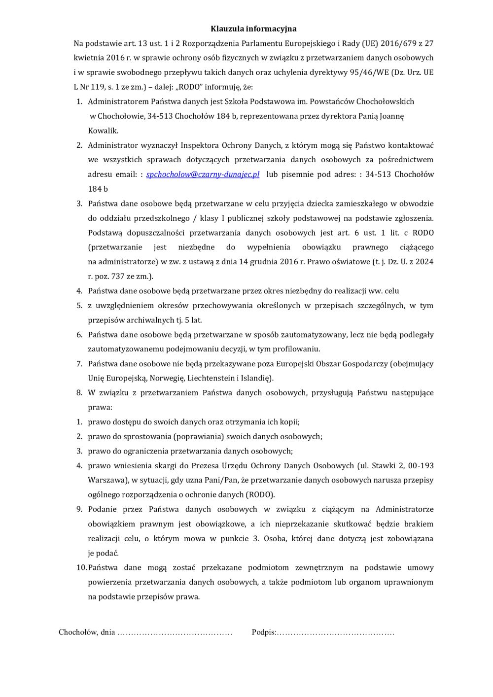 3) dyrektorze szkoły – należy przez to rozumieć Dyrektora Szkoły Podstawowej im. Powstańców Chochołowskich w Chochołowie;